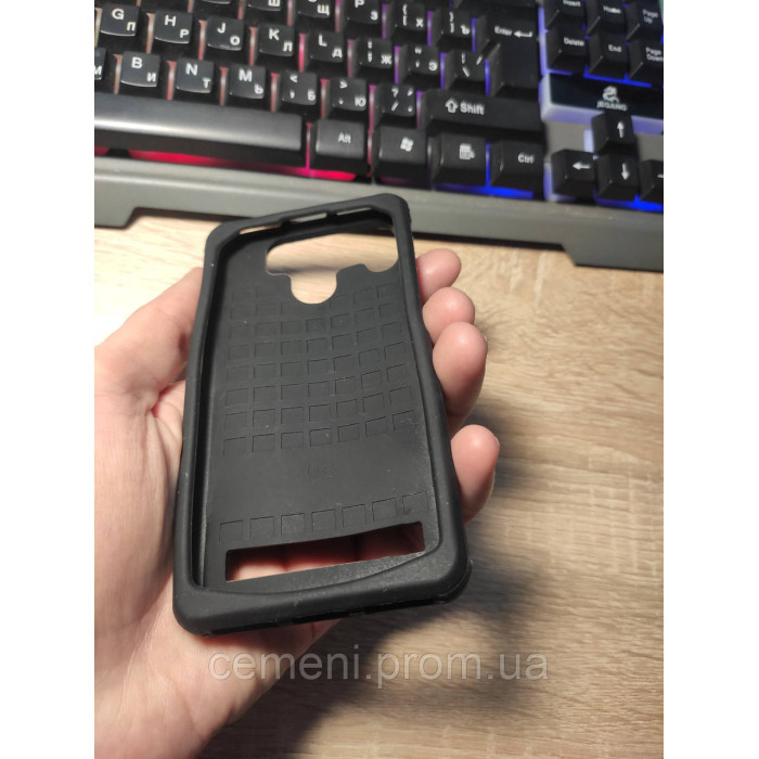 Смартфон удерживается в универсальном силиконовом держателе, который подходит ко многим моделям.